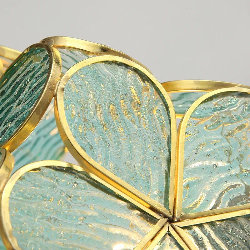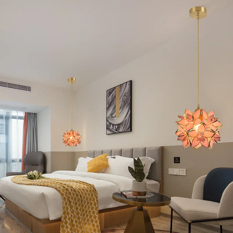 This pendant lamp is a true work of art, combining handcrafted artistry with the elegance of decorative lighting. Its shade is made of colourful glass pieces set in a golden frame, arranged to resemble flower petals or organic natural forms. Each glass segment gently diffuses the light, creating a beautiful play of colours and reflections that brings a warm, artistic atmosphere to any space.