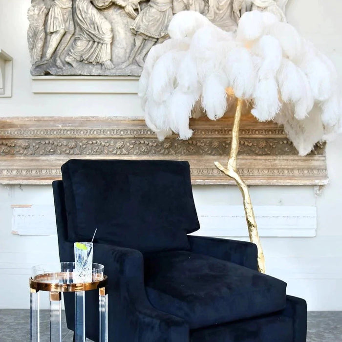 Make a bold style statement with this exquisite palm tree-inspired floor lamp, adorned with genuine ostrich feathers. Designed to captivate, the cascading feathers diffuse a soft, warm light that transforms any space into an elegant and inviting retreat. Perfect as a centrepiece in living rooms, bedrooms, or luxury interiors.