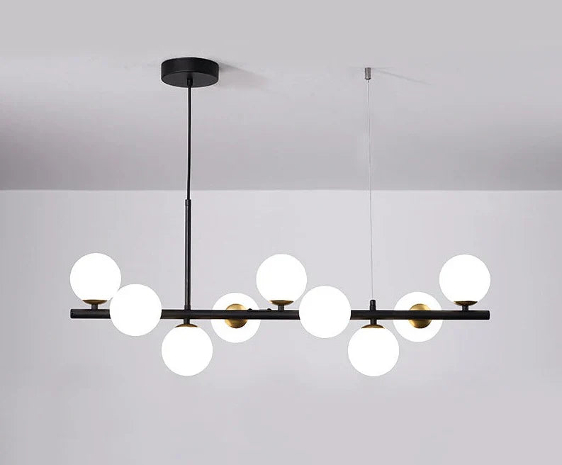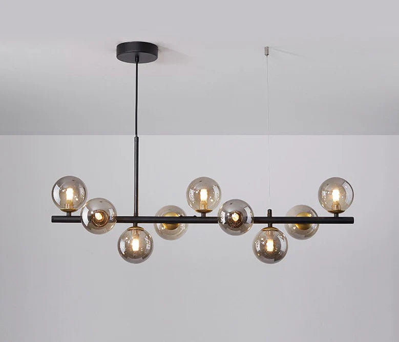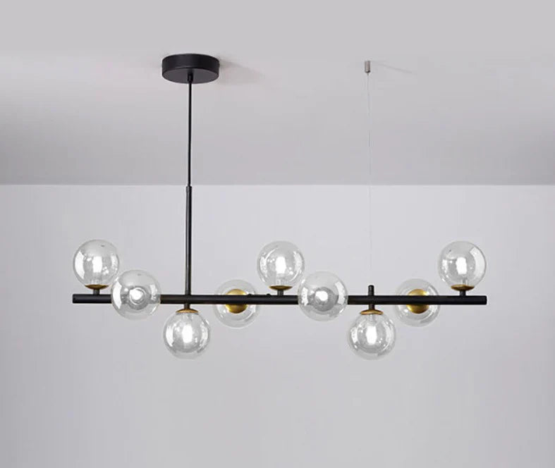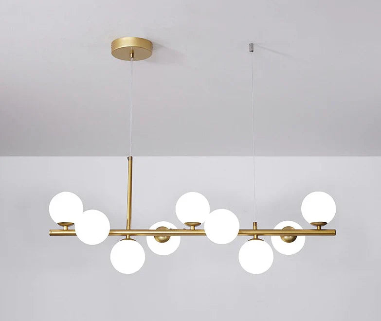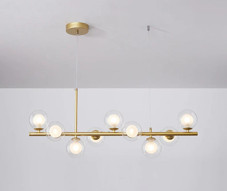 This elegant pendant light with spherical glass shades is a modern lighting solution, perfect for dining rooms, living areas, or commercial spaces. The minimalist design features a sleek gold frame paired with glass globes, offering even light distribution and a luxurious touch. It looks stunning suspended over a dining table or kitchen island.