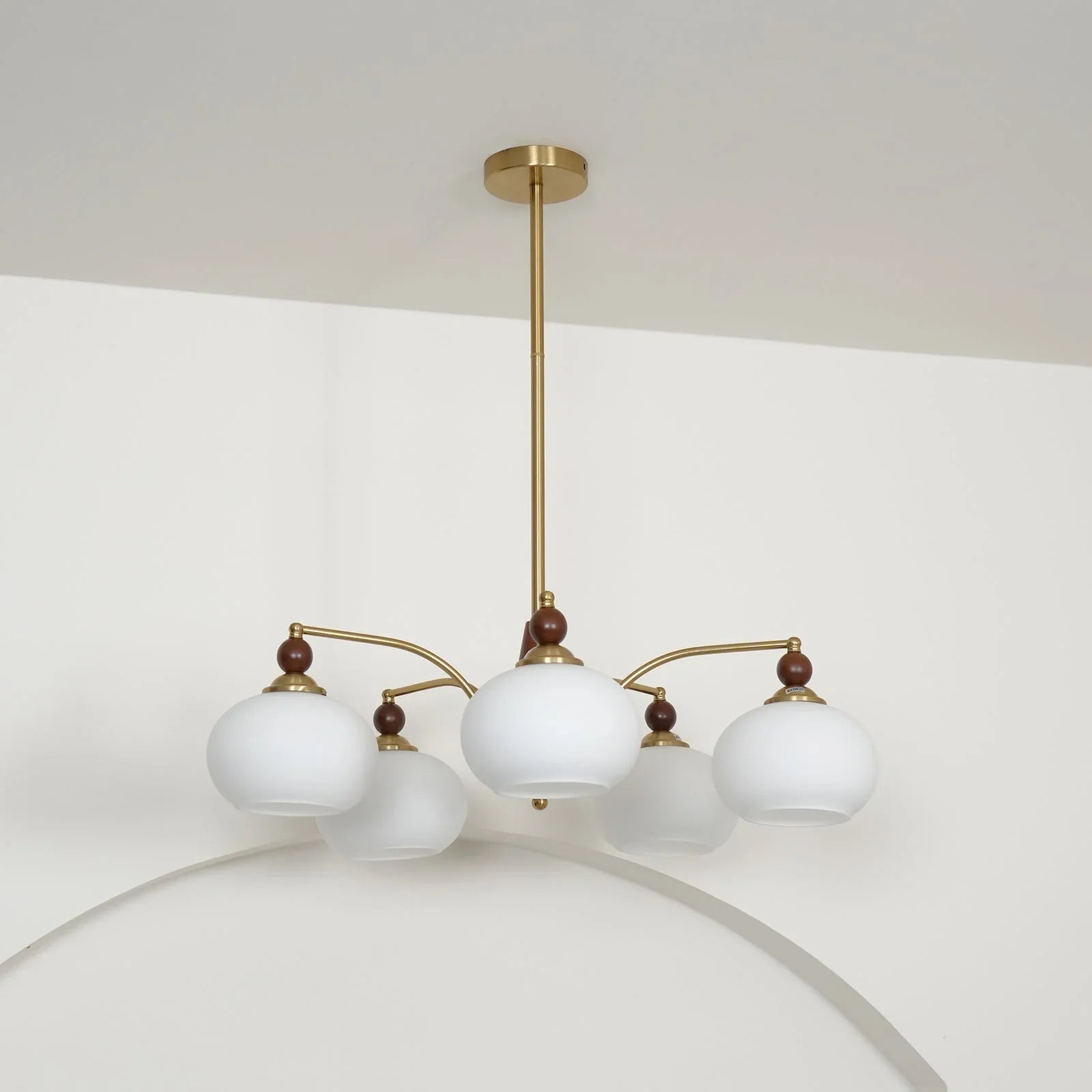 Crafted from premium wood and brass, the chandelier impresses with its noble finish, while the golden-yellow glass shades diffuse a warm, inviting light that evokes a sense of nostalgia and sophistication. Perfect for both modern and classic interiors, it adds a touch of retro refinement and enduring style to any space.